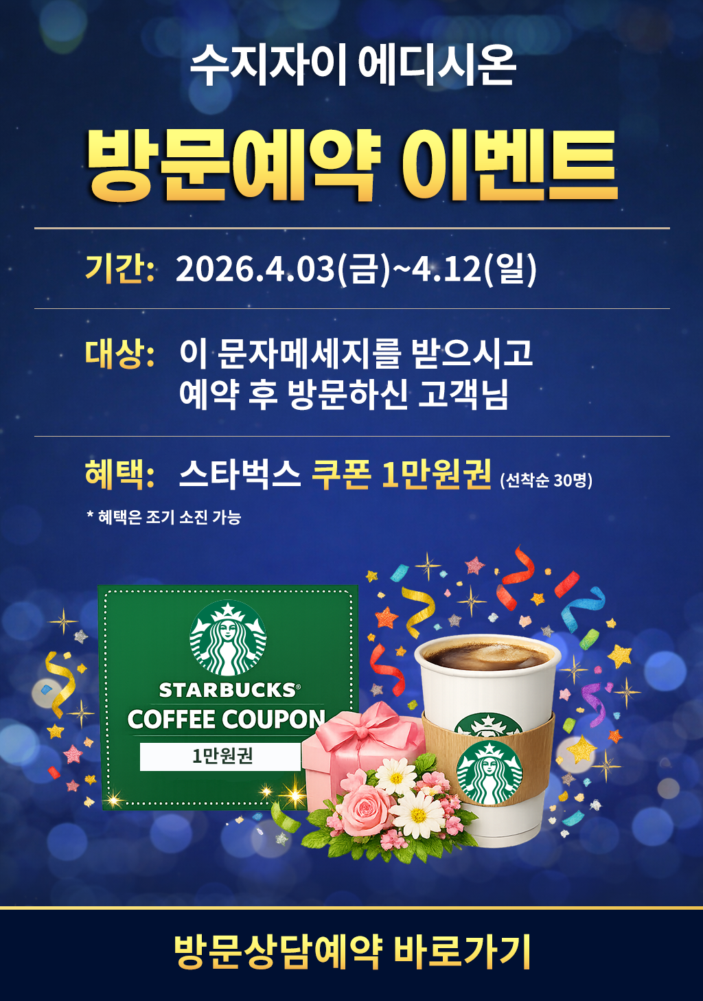 수지자이 에디시온 방문예약 고객의 개인정보를 수집합니다. 수집한 개인정보는 방문예약 이외의 목적으로는 사용하지 않으며, 아파트 모집 기간 완료 후 즉시 파기합니다. 개인정보의 수집 및 이용에 대한 동의를 거부할 수 있으며, 이 경우 방문예약 접수가 어려울 수 있습니다.